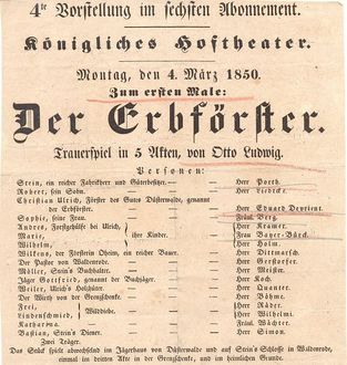 Am 4. März 1850, also vor 175 Jahren wurde in der Dresdner Semperoper das Drama „Der Erbförster“ von Otto Ludwig aufgeführt. Der Dichter und Literaturtheoretiker wurde 1813 in Eisfeld geboren. In diesem Drama verarbeitet Ludwig seine eigene Familiengeschichte. Sein Vater, Stadtsyndikus soll gemäß den Steinschen Reformen eine neue Stadtverfassung einführen. Dies scheitert am Widerstand der Bürger und führt am 7. Juli 1822 zum letzten großen Stadtbrand in Eisfeld. Der Vater ersetzt aus Ehrgefühl der Stadt den entstanden Schaden aus seinem Privatvermögen, die Familie ist schlagartig arm. Der Vater stirbt an den seelischen Folgen kurz darauf.