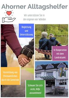 Die Gemeinde Ahorn sucht ehrenamtlich engagierte Personen, die im Konzept der Alltagshelfer mitarbeiten möchten. Im Landkreis ist das Konzept auch unter dem Namen der Häuslichen Hilfen ein Begriff. Ein breitgefächertes Fortbildungsprogramm wird den Ehrenamtlichen angeboten sowie regelmäßiger Austausch untereinander.