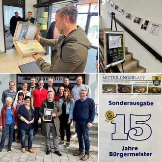 Mit dem Mai begann auch vor 15 Jahren meine Zeit als Bürgermeister für unsere Gemeinde und die lieben Wünsche meiner beiden Stellvertreter und Mitarbeiter waren für mich eine besondere Freude. Hinzu kam eine kleine Bilderausstellung der vergangenen Jahre, die an gemeinsame Projekte, vor allem aber auch an die Begleitung durch ganz unterschiedliche Menschen, die heute teils gar nicht mehr bei uns sind, erinnert. Persönlich fühlt es sich an, als wäre es erst gestern gewesen und ich danke abschließend Ihnen allen für die vertrauensvolle Begleitung meiner Arbeit.