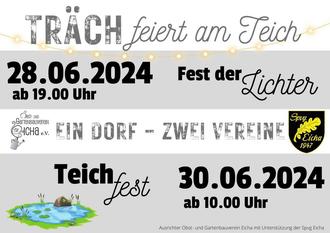 Auf buntes Treiben und stimmungsvolles Ambiente dürfen sich die Besucher freuen, wenn sich der malerische Ortseingang von Eicha am Freitag, 28., und Sonntag, 30. Juni, wieder in einen großen Festplatz verwandelt. Unter dem Motto „Träch feiert am Teich“ lädt der Obst- und Gartenbauverein Eicha mit Unterstützung der Sportvereinigung Eicha am Freitagabend ab 19 Uhr zum „Fest der Lichter“ ein, am Sonntag geht es beim Teichfest schon ab 10 Uhr mit einem feierlichen Gottesdienst los.