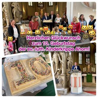 Es gibt Jubiläen, bei denen hat man noch die Grundsteinlegung und das Richtfest vor Augen und ist erstaunt, wie schnell die Jahre vergehen. Beim 10-jährigen Bestehen der ev.-luth. Kinderkrippe in Ahorn hatte ich einen dieser Momente und konnte mich noch gut an die intensive Zeit der Planungen mit Pfarrer Gorny erinnern, die ehemaligen Gebäude der Familie Stehli und den Garten der Familie Wilhelm. Schön zu sehen, dass die Idee des „Kindercampus“ nun bereits im 10. Jahr mit Leben erfüllt wird und ein herzlicher Dank an die hervorragenden Mitarbeiter unseres Kinderhauses, sowie auch ein großer Dank an den Elternbeirat für die gute Bewirtung sowie Franz Schön und dem Posaunenchor für den gelungenen Gottesdienst. Als kleines Geschenk gab es, wie für Geburtstage üblich, einen großen und bunten Kuchen für alle Kinder.