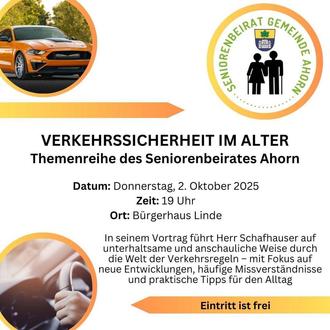 Die Veranstaltung findet am Donnerstag, den 02. Oktober 2025, um 19:00 Uhr im großen Saal des Bürgerhauses Linde in Ahorn statt. In seinem Vortrag führt Herr Schafhauser auf unterhaltsame und anschauliche Weise durch die Welt der Verkehrsregeln – mit Fokus auf neue Entwicklungen, häufige Missverständnisse und praktische Tipps für den Alltag. Der Vortrag richtet sich an alle, die im Straßenverkehr sicher unterwegs sein wollen, ob als Autofahrer*in, Radfahrer*in oder Fußgänger*in. Der Eintritt ist frei, eine Anmeldung ist nicht erforderlich. Der Seniorenbeirat freut sich auf viele interessierte Teilnehmer*innen.
