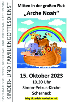 | 10.30 Uhr | Kinder- und Familiengottesdienst "Mitten in der großen Flut: Arche Noah", mit Taufe Simon-Petrus-Kirche mit: Pfarrerin Stark und Team |