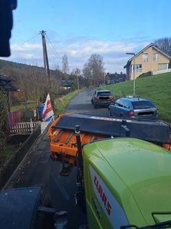Um einen besseren Eindruck von der Lage zu bekommen, fanden daher zwei Rundfahrten mit den Räumfahrzeugen des Gemeinde Bauhofes und der Straßenmeisterei statt. Hierbei konnte man sich einen guten Überblick verschaffen und neue Erkenntnisse erlangen. Wie der Mitarbeiter der Straßenmeisterei Bad König mitteilt, hat alleine der Räumschild eine Länge von über 3,00 Metern. Immer wieder musste er während der Fahrt höchste Vorsicht walten lassen und den Winkel des Schildes ändern um Engstellen passieren zu können. Bei Schnee kommt erschwerend hinzu, dass die Sichtverhältnisse stark eingeschränkt sind und man teilweise geblendet wird, wie der Fahrer mitteilte. Kommen dann noch parkende Fahrzeuge, oder überhängender Pflanzenbewuchs hinzu wird es oftmals sehr kritisch.