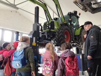 Nachdem wir jetzt fast 3 Monate an unserem Langzeitprojekt gearbeitet haben, wollten wir uns eine echte Traktor - Werkstatt anschauen. Also machte die ganze Gruppe einen Ausflug zur Firma Gölz Landtechnik nach Langen - Brombach. Hier konnten wir sogar live bei einem Traktor Ölwechsel zuschauen. Das Highlight war aber, dass jedes Kind auf den verschiedenen Traktoren einmal Probesitzen durfte.
