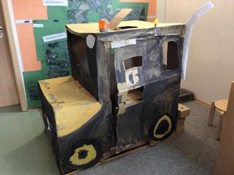 Es wurden Woche für Woche neue Dinge angebaut. Ein Lenkrad, ein Tacho, der Auspuff, die Rückleuchten und ein Scheibenwischer. Eine besondere Herausforderung stellte die Anfertigung des Druckkessels dar. Den Kindern fielen, während sie in der Zwischenzeit schon in dem Bulldog spielten, immer wieder neue Teile ein, die noch ergänzt werden mussten. Also wurde reflektiert und neu überlegt, die passenden Materialien gesucht und weitergebaut.