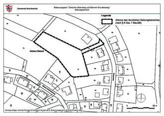 Der Geltungsbereich des Bebauungsplanes befindet sich im Nordwesten von Kirchbrombach und umfasst die Flurstücks-Nr. 71 und 73 in der Flur 3, Gmkg. Kirch-Brombach. Die Fläche des Geltungsbereiches beträgt knapp 0,36 ha, wovon die Bauflächen nur 0,2 ha einnehmen. Der räumliche Geltungsbereich des Bebauungsplanes ergibt sich ebenso aus dem beigefügten Kartenausschnitt (Lageplan) in dem der Planbereich gekennzeichnet ist. Der Kartenausschnitt ist als Anlage Teil dieser Bekanntmachung.