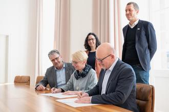 Auch in Zukunft unterstützt der Förderverein der Odenwald Akademie e. V. hervorragende Leistungen von Studierenden durch die Auslobung des Akademie-Preises. Die entsprechende Vereinbarung mit der Technischen Universität Darmstadt unterschrieben kürzlich (am Tisch von links nach rechts) Rüdiger Holschuh (Vorsitzender der Odenwald-Akademie), Prof. Dr. Tanja Brühl (Präsidentin der TU Darmstadt) und Landrat Frank Matiaske (Vorstandsmitglied des Fördervereins) sowie (stehend) Dr. Patrick Honecker (Chief Communication Officer der TU Darmstadt). Raquel Jarillo, Geschäftsführerin der Odenwald-Akademie freute sich, dass die gute Zusammenarbeit fortgesetzt wird.