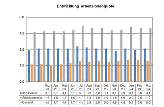 Den größten Rückgang gab es bei den älteren arbeitslos gemeldeten Personen über 50: Die Anzahl ist um 24 auf 877 gesunken. Bei der Zahl der Arbeitslosen ohne deutschen Pass ist ein Rückgang um 14 auf 1.136 Personen zu verzeichnen. Ebenfalls gesunken ist die Zahl der arbeitslos gemeldeten Frauen – um sieben auf 1.222. Um acht auf 311 gestiegen ist dagegen die Zahl der arbeitslos gemeldeten Jüngeren zwischen 15 bis 24 Jahren.