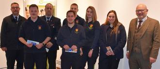 Landrat Frank Matiaske überreichte gemeinsamem mit dem Gemeindebrandinspektor der Gemeinde Reichelsheim Holger Zieres (links) E-Card an Engagierte der Reichelsheimer Feuerwehr: (von links nach rechts) Florian Lohbrunner, Robert Schmidt, Julian Neff, Philipp Zieres, Maleen Uhrmacher und Natascha Erbeldinger-Neubert.