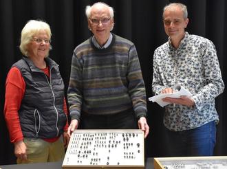 Anschaulich: Die Insektenkundler Waltraud Dieler und Werner Horn – hier zusammen mit Prof. Dr. Nico Blüthgen von der TU Darmstadt (rechts) – haben Schaukästen mit 199 Laufkäferarten mitgebracht, die wie der Vortrag selbst auf großes Interesse stießen.