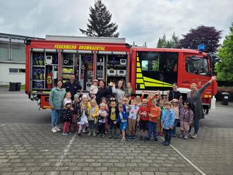 Das Feuerwehrauto traf schnell ein und alle waren gespannt. Für viele Kinder war das Martinshorn der Feuerwehr sehr laut. Eine Entwarnung erfolgte durch die Einsatzkräfte der Feuerwehr.