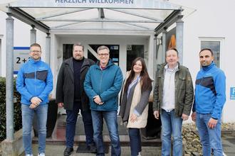 Mitarbeitende des Kommunalen Job-Centers, Patrick Beck (Teamleiter U25), Marco Fries (Teamleiter Eingliederung), Carolin Schön (Arbeitgeberservice), und des Bildungsträgers InA gGmbH (Matthias Weiser) informierten sich bei Andreas Rausch (links) und Caner Sinsik (rechts), Geschäftsführer der wunderbar clean technology GmbH in Michelstadt, über die Arbeitsbereiche in ihrem Unternehmen.
