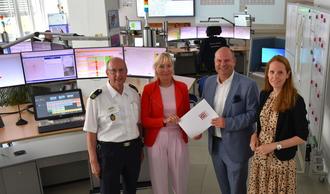 Für das Projekt „Katastrophenschutz goes digital“ erhält der Odenwaldkreis eine Förderung aus dem Programm „Starke Heimat Hessen“. Digitalministerin Prof. Dr. Kristina Sinemus (zweite von links) übergab den entsprechenden Bescheid an Ersten Kreisbeigeordneten Oliver Grobeis (zweiter von rechts) und Kreisbrandinspektor Horst Friedrich (links). Mit dabei war auch Landtagsabgeordnete Sandra Funken.