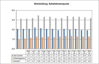 Den größten Anstieg gab es bei der Zahl der Arbeitslosen ohne deutschen Pass – um zwölf auf 1.115. Die Zahl der der arbeitslos gemeldeten Frauen ist um eins auf 1.203 gestiegen während die Zahl der älteren arbeitslos gemeldeten Personen über 50 unverändert bei 845 liegt. Bei den arbeitslos gemeldeten Jüngeren zwischen 15 bis 24 Jahren wurde ein Rückgang um eine Person auf 304 verzeichnet.