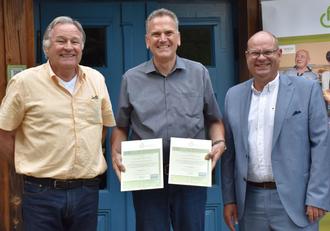 E-Card-Inhaberinnen und -inhaber erhalten im Odenwaldkreis an über 100 Orten Vergünstigungen als Dankeschön für ihr Engagement. Als neuer Sponsorenpartner erhielt Hans Thierolf, Geschäftsführer des Autohauses „Treffpunkt Thierolf“ (Mitte), die entsprechenden Urkunden für die Standorte Michelstadt und Höchst von Erstem Kreisbeigeordnetem Oliver Grobeis. Auch Reinhold Göbel, Erster Beigeordneter der Gemeinde Höchst, bedankte sich für die Unterstützung.