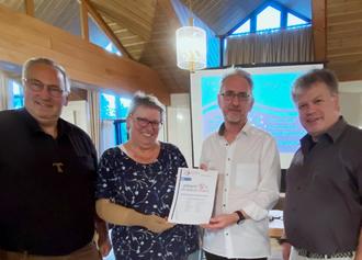 : v.l. Diakon Volkmar Raabe, PGR-Vorsitzende von Bad König Rita German, Koordinator des Pastoralraumes Pastoralreferent Cyriakus Schmidt, Leitender Pfarrer des Pastoralraumes Pfarrer Harald Poggel. Mitglieder des AK ISK übergeben der Leitung des Pastoralraumes den Entwurf eines ISK
