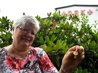 Einen Anstecker und ein besonders hübsches Rotes Kreuz als Anhänger nebst Urkunde hat Heidrun Trautmann kürzlich für ihre 125 Blutspenden in Wiesbaden erhalten.