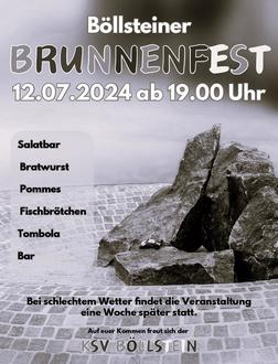 Am 12.07.2024 findet ab 19:00 Uhr wieder das traditionelle Brunnenfest des KSV Böllstein e.V. statt. Neben einer umfangreichen Salatbar, Bratwurst und Pommes gibt es auch die allseits beliebten Fischbrötchen. Zu späterer Stunde wird dann auch die Bar im Pumphäuschen geöffnet.