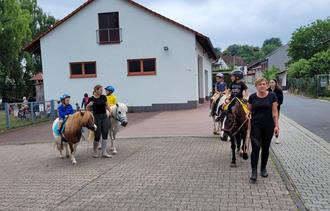 Anschließend ging es vom Pferdehof zum Hummetrother Spielplatz und von dort aus ritten jeweils vier Kinder eine Runde, während die restlichen Kinder den Spielplatz erkundeten und sich so richtig austobten. Wieder auf dem Nussbaumhof angekommen, stärkten sich die Kinder mit einem Mittags-Snack. Zum Schluss bekamen alle ein Pferdemalbuch von Frau Berg geschenkt.