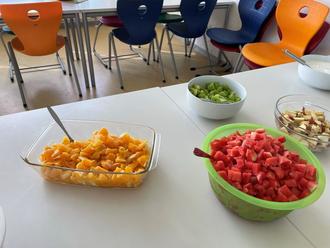 In der Cafeteria wurde ein reichhaltiges Frühstücksbuffet mit einer Vielzahl gesunder Optionen aufgebaut: Müsli, Quark, Joghurt, Milch und eine bunte Auswahl an frischen Früchten. Um 9 Uhr war es dann endlich so weit: Die Schülerinnen und Schüler konnten nach und nach in die Cafeteria kommen, um sich ihr individuelles Müsli oder auch einfach einen leckeren Obstsalat zusammenzustellen.