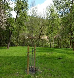 Auf einer Streuobstwiese wurde im Rahmen der Streuobstaktion eine Butterbirne gepflanzt, um den Bestand zu ergänzen.