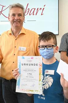 Bürgermeister Andreas Koch aus dem Brombachtal durfte Yannick aus Brensbach zu seinem 3. Platz in der Kategorie Kinder-Zeichnung "Ein Tag auf dem Land" gratulieren. Eine weitere Platzierung ging nach Brensbach. Tristan erhielt den 1. Platz in der Kategorie Kinder-Zeichnung für sein faszinierendes Bild mit dem Titel "Mensch", das ein im kubistischen Stil gezeichnetes Gesicht zeigt. Larissa aus Bad König freute sich über den 3. Platz in der Kategorie Jugendliche für das Werk "Cola-Flasche".
