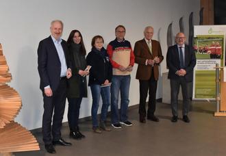 Landrat Frank Matiaske (r.) und Bürgermeister Eric Engels, Fränkisch-Crumbach (l.), würdigen die ehrenamtlich Engagierten im Odenwaldkreis (v.l.n.r.): Sophia Arnold (Weiße Wiesel e. V.), Brigitte Rodenhausen (Notfallseelsorge und Krisenintervention), Uwe Göttmann (Hegegemeinschaft Reichelsheim e. V.) und Dr. Jürgen-Friedrich Kammer (Förderverein Burg Freienstein e. V.).