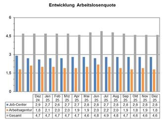 Im Odenwaldkreis ist die Zahl der arbeitslos gemeldeten Bürgerinnen und Bürger im Dezember leicht angestiegen – von 2.413 auf 2.414. Die Arbeitslosenquote beträgt jedoch unverändert 4,6 Prozent (Vorjahr 4,7 Prozent). Betrachtet man die beiden Rechtskreise getrennt voneinander, ist im Vergleich zum November 2025 in der Zuständigkeit des Kommunalen Job-Centers (SGB II) ein Anstieg um 19 Personen auf 1.461 Personen zu verzeichnen. Im Bereich der Agentur für Arbeit waren im Monat Dezember 953 Personen arbeitslos gemeldet, 18 weniger als im Vormonat.