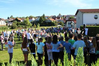 Anschließend fand ab 9:30 Uhr die schulische Feier auf dem Sportplatz statt. Schulleiterin Frau Götz begrüßte alle Gäste und erzählte die Geschichte vom Löwen, der auch in die Schule kam und Magengrummeln hatte. Danach gab es ein kleines Programm, das von Viertklässler/innen und ihren Lehrerinnen gestaltet wurde. Die Kinder sangen das Lied „So seid willkommen“, tanzten zu „Iko Iko“ und sangen zum Abschluss noch den Hit „Komet“.