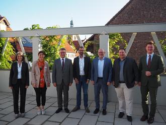 Drei-Landräte-Treffen in Waldbrunn. (v.l.) Susanne Seidel (Landkreis Miltenberg), Marion Günther und Landrat Dr. Achim Brötel (Neckar-Odenwald-Kreis), Jens Marco Scherf (Landkreis Miltenberg), Landrat Frank Matiaske (Odenwaldkreis), Bürgermeister Markus Haas, Marvin Donig (Odenwaldkreis).