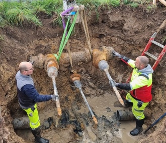 und durch ein neues ersetzt. Da es sich um die Hauptleitung handelt, liegt die Leitungsdimension bei DN 200, entsprechend 20 cm im Innendurchmesser der Leitung. Gegen 10:30 Uhr konnten die Arbeiten an den Trinkwasserleitungen erfolgreich beendet werden. Nach Entlüften und Wiederbefüllen der Leitungen konnte am frühen Mittag der „normale“ Betriebszustand wiederhergestellt werden.