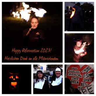 Ein großer Schatz an diesem Abend war, dass sich viele unterschiedliche Gruppen beteiligt haben. Der Kirchenvorstand überzeugte im Nonnenkostüm. Die Konfirmanden übernahmen die Arbeitsdienste. Die Grundschulkinder schnitzten die Halloween-Kürbisse. Die Trommler vom TSV gaben den Takt vor. Die Feuerwehr sorgte für sicheres Geleit. Die Gruppe AygenArt steuerte mittelalterliche Klänge bei. Die Feuergirls 2.0 aus Böllstein feierten ein gelungenes Comeback. Viele Helfer bauten auf und später wieder ab. Ihnen allen gilt ein herzliches Dankeschön für Idee, Planung und Durchführung. Es war ein gelungenes Fest.