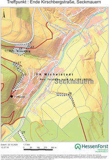 Der Treffpunkt für die Veranstaltung ist am Ende der Straße „Kirschberg“ in Lützelbach, Ortsteil Seckmauern: Wo die öffentliche Straße in den Forstweg übergeht, beginnt die zu Fuß stattfindende Exkursion.