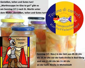 „Martinssuppe im Glas to go!“ gibt es am Sonntag (17.11.) unter dem Motto „Genießen, teilen und Gutes tun!“ nach den Gottesdiensten vor den katholischen Kirchen in Bad König und Michelstadt gegen eine Spende für bedürftige Menschen in sozialen Brennpunkten von Caransebeş in Rumänien.