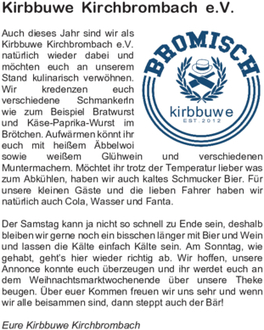 Auch dieses Jahr sind wir als Kirbbuwe Kirchbrombach e.V. natürlich wieder dabei und möchten euch an unserem Stand kulinarisch verwöhnen. Wir kredenzen euch verschiedene Schmankerln wie zum Beispiel Bratwurst und Käse-Paprika-Wurst im Brötchen. Aufwärmen könnt ihr euch mit heißem Äbbelwoi