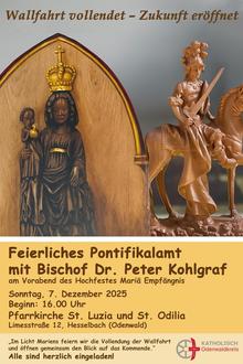 Am Sonntag, 07.12., 16:00 Uhr findet in der Kath. Kirche in Hesselbach der festliche Gottesdienst zum Abschluss einer zweijährigen Wallfahrt statt! Am Vorabend des Hochfestes der Unbefleckten Empfängnis Mariens, sind alle Gläubigen und Interessierten des Pastoralraumes Odenwaldkreis zu einem festlichen Gottesdienst mit Bischof Peter Kohlgraf herzlich eingeladen.