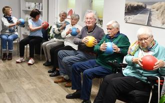 Zu ihren musikalisch untermalten Bewegungsprogrammen gehörte das so schlicht klingende Wippen mit dem Vorderfuß oder der Ferse. Da brauchte es Taktgefühl zu den flotten Weisen. Nach dem gemütlichen Beisammensein bei Kuchen und Kaffee trainierten die Damen und Herren für einen aktiven Alltag. „Das betrifft nicht nur die großen, sondern auch die kleinen Gelenke, die sich an den Zehen und den Fingern befinden. Denn auch hier muss die Muskulatur trainiert werden“, informierte Zellmann ihre Gäste.