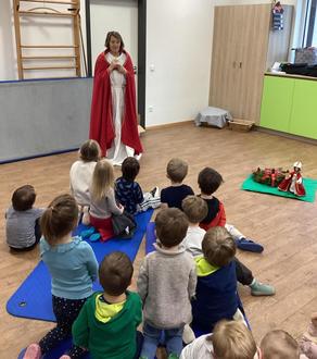 Um den Kindern den Niklaus angstfrei nahe zu bringen, hat sich eine Erzieherin vor den Augen der Kinder durch ein Kostüm in den heiligen Niklaus verwandelt. Gemeinsam überlegten die Kinder auch, wie sie in ihrem Alltag anderen Kindern helfen können. So wie einst der Nikolaus für andere da war, wollen wir auch für andere Menschen da sein.