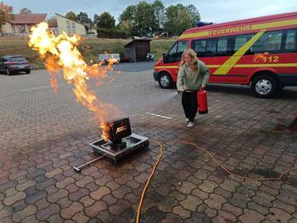 Marius Fischer erklärte anschaulich, wie man sich in verschiedenen Brandsituationen richtig verhält und welche Feuerlöscher wofür geeignet sind. Nach der Theorie folgte der spannende Teil: Jede Mitarbeiterin durfte selbst zum Feuerlöscher greifen und ausprobieren, wie man ein Feuer sicher bekämpft.