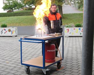 Aber auch die Vorführung von Herrn Rienecker vor dem Schulgebäude, wie man eine brennende Pfanne löschen sollte, war sehr interessant: