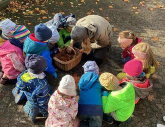 Danach ging es nach draußen und wir sammelten Eicheln, Ahornblätter, Hagebutten, Walnüsse und Lindenblätter, die wie ein Herz aussehen. Wir bekamen Rätsel gestellt und sollten das jeweilige Tier erraten z.B. Fuchs, Eichhörnchen oder Dachs. Nach tollen Bewegungsspielen legten wir noch ein wunderschönes Mandala aus unseren gesammelten Früchten und so ging ein toller Vormittag zu Ende.