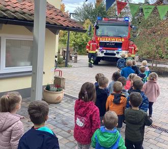 Die Feuerwehr als unmittelbarer Nachbar vom Kindergarten erweckt schon immer bei den Kindern großes Interesse. Sobald sich die Tore vom Feuerwehrhaus öffnen, stehen die Kinder interessiert am Zaun und schauen dem Treiben zu. Im Projekt „Feuer, Feuerwehr und Brandschutz“ erlebten und erfuhren die Kinder jede Menge Spannendes. Ein Höhepunkt davon war, als der 1. und 2. Kommandant der Feuerwehr Oberleichtersbach zu Besuch in den Kindergarten kamen. Die beiden Feuerwehrmänner waren ganz erstaunt, was einige Kinder schon alles über die Feuerwehr wussten. Von der Nummer 112 bis zur Wärmebildkamera war alles dabei. Mathias Ziegler kam sogar als „echter“ Feuerwehrmann und stellte die Schutzkleidung vor, die ein Feuerwehrmann bei einem Einsatz tragen muss. Anschließend zeigte Andreas Seidenthal das beeindruckende Feuerwehrauto. Wer wollte, durfte dort Platz nehmen, wo sonst nur die Feuerwehrfrauen und -männer sitzen. Herr Seidenthal erklärte den Kindern, dass das Feuerwehrauto wie eine große Werkzeugkiste ist - alles hat seinen genauen Platz. Eine Brandschutzübung rundete das Projekt ab. Der schrille Hausalarm ertönte und schnurstracks verließen die Kinder mit ihren Erzieherinnen über die Fluchtwege den Kindergarten. Nun kennen die Kinder die wichtige Bedeutung der grünen Schilder über manchen Türen. Der Sammelplatz befindet sich an der Grundschule. Diese Aktion wurde auch von beiden Kommandanten begleitet. Es ging alles gut – aber wir hoffen natürlich dennoch, dass es nie zu einem Ernstfall kommt.