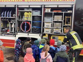 Am 09.10. besuchten Matthias Ziegler und Mario Jordan die Rotmilan– und Fuchskinder im Kindergarten. In dieser Woche lernten wir jeden Tag viel über Brandschutz und die Feuerwehr. Matthias erzählte uns wann die Feuerwehr immer hilft, nämlich z.B. bei einem Unfall, bei Sturm und Unwetter, und natürlich wenn es brennt. Er nannte nochmal die Nummer 112 und erklärte welche Fragen am Telefon gestellt werden und dass die Nummer wirklich nur im Ernstfall gewählt werden darf. Begeistert von dem Wissen der Kinder zeigten die beiden Feuerwehrmänner auch noch die ganze Schutzbekleidung. Mario zeigte den Kindern in Kleingruppen was alles in dem großen Feuerwehrauto zu finden ist. So viele Sachen sind dort untergebracht – Schläuche, Werkzeug, Sprungtuch etc. Das absolute Highlight war, dass jedes Kind sich wie die echten Feuerwehrleute, in das Auto setzen durfte.