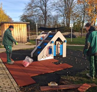 Im Zuge der Spielplatzerweiterung erhielten die Krippenkinder auch ein neues Spielgerät: Zukünftig können sie ihre verschmutzten Bobbycars mit einem Hochdruckreiniger abspritzen und anschließend durch die Waschanlage fahren. Da die Kinder das Häuschen auch beklettern können, muss ein entsprechend großer Bereich mit Fallschutzmatten ausgelegt werden.