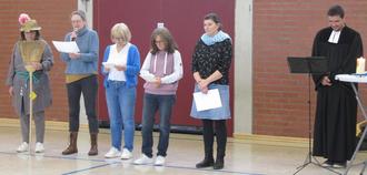 Lehrerin Kirsten Gerbig und Pfarrer Hönerlage bereiteten mit wunderbaren Liedern und einem sehr passenden szenischen Spiel diese religiöse Feier vor.