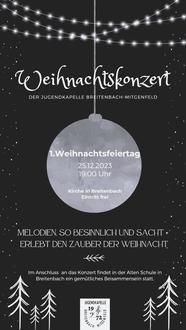 Nach 3 Jahren Pause halten wir, die Jugendkapelle Breitenbach/Mitgenfeld e.V., endlich wieder unser traditionelles Weihnachtskonzert in der Kirche zur Hl. Familie in Breitenbach. Am ersten Weihnachtsfeiertag seid ihr ab 19 Uhr eingeladen, den weihnachtlichen Klängen und Melodien zu lauschen. Von traditionellen Liedern und Klassikern über gefühlvolle Solostücke bis zu flotter Weihnachtsmusik ist für jeden Geschmack etwas dabei.