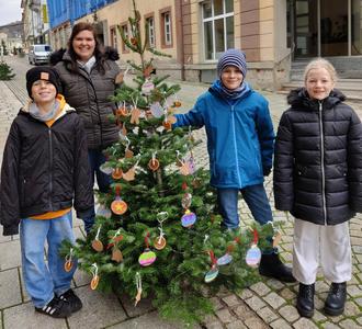 Am Donnerstag, 28. November, fuhren stellvertretend für die „Bastelkinder“ Emma, Luan und Rafael mit Frau Oschmann-Hockgeiger und Edith Schaub in die Innenstadt, um den der Schule zugewiesenen Tannenbaum zu schmücken.