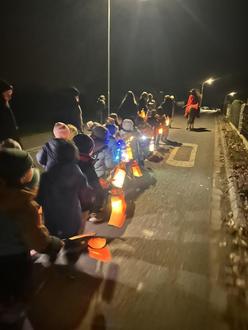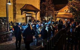 Vor den Kirchentüren wartete bereits St. Martin auf einem Pferd – dargestellt von einer engagierten Kindergartenmutter. Mit ihren selbstgebastelten Laternen zogen die Kinder und Erwachsenen in einem langen Zug hinter ihm her und erhellten die dunklen Straßen des Ortes. Für musikalische Begleitung sorgte die Musikkapelle des MSV Modlos, während die Feuerwehr mit Straßensperrungen für Sicherheit und einen reibungslosen Ablauf garantierte.