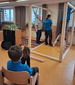 In Zusammenarbeit mit den Auszubildenden der Firma Hanse Haus entstand ein stabiles Holzgestell, das als Grundgerüst für den neuen „Raum im Raum“ dient. Mit großem Engagement, Fachwissen und handwerklichem Geschick errichteten die angehenden Fachkräfte die Konstruktion, die nun von den Kindern selbst weitergestaltet werden kann. Ob Kuschelecke, Lesehöhle oder fantasievoll dekorierter Rückzugsort – der Kreativität sind keine Grenzen gesetzt.